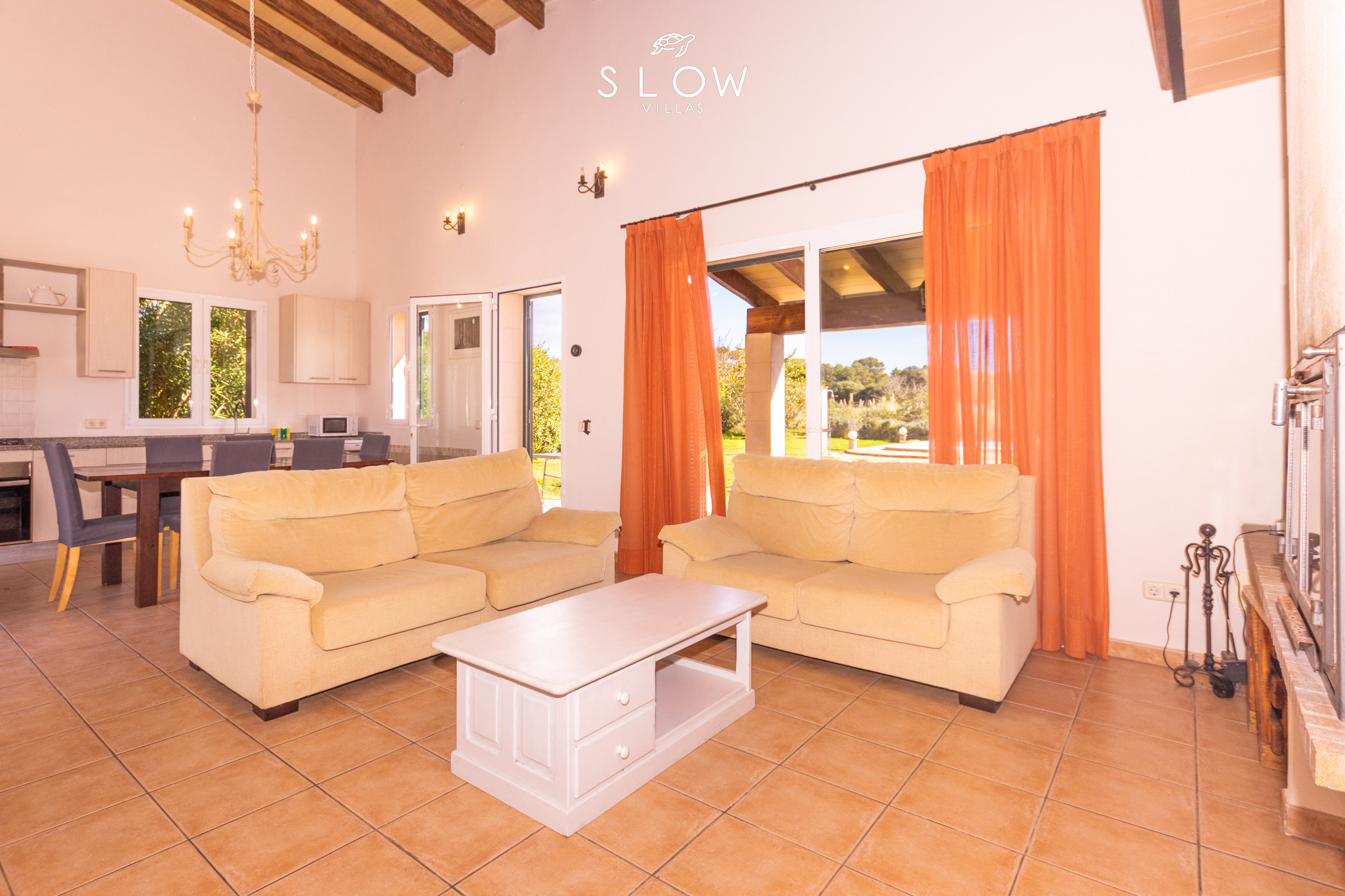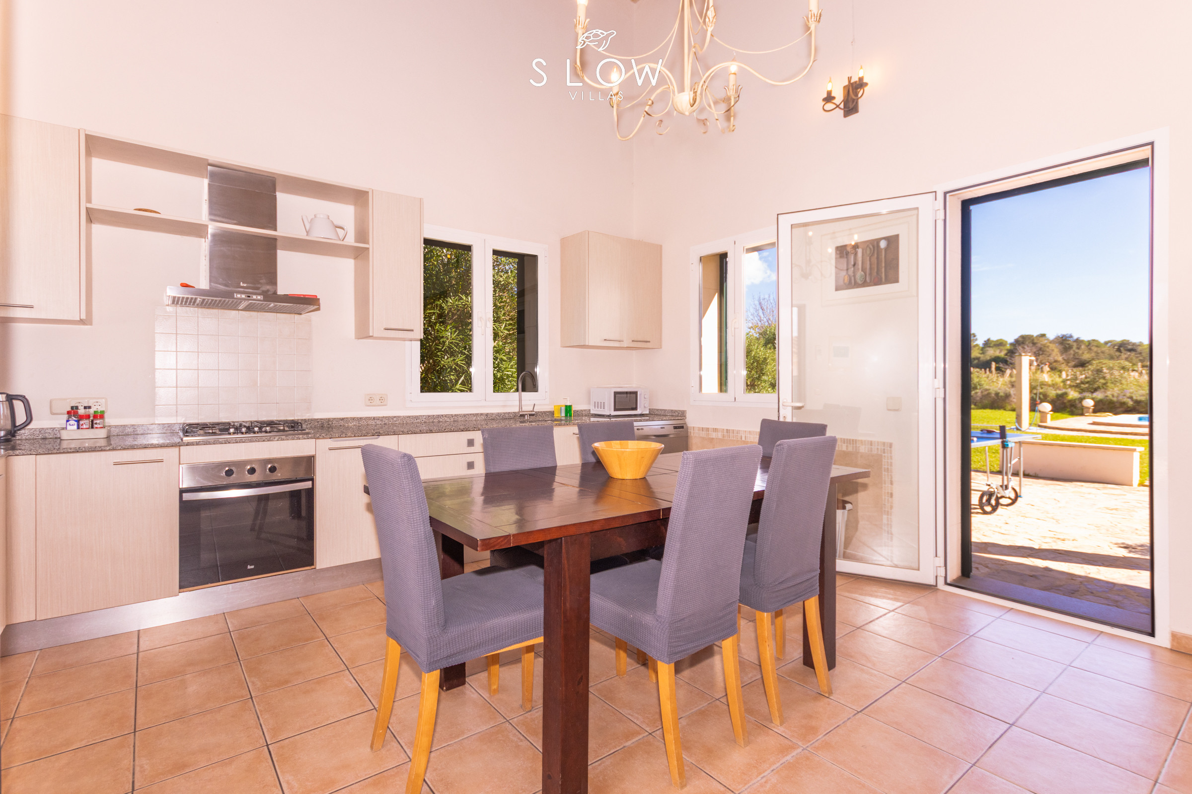 Villa Son Pere fue construida en 2014 con materiales de alta calidad, está decorada con mucho gusto y está llena de la luz natural por toda la casa. Una vez ha entrado al interior, se sentirá recibido por un ambiente acogedor y hogareño. Un salón - comedor parcialmente abierto con cocina integrada forma el corazón de la casa: dos cómodos sofás están frente a una chimenea y una televisión le invita a entretenerse, relajarse con un libro o charlar entre familiares y amigos. Si es necesario, puede encender la estufa de leña para y disfrutar de un calor reconfortante y una sensación hogareña en las noches más frescas. En el centro, tendrá una gran mesa de comedor de madera maciza alrededor de la cual podrán sentarse todos juntos y cenar en el interior. La moderna cocina está junto al comedor, está equipada con los electrodomésticos de alta calidad y tiene suficiente espacio de almacenamiento y una gran encimera donde varias personas puedan preparar comidas juntas al mismo tiempo.
