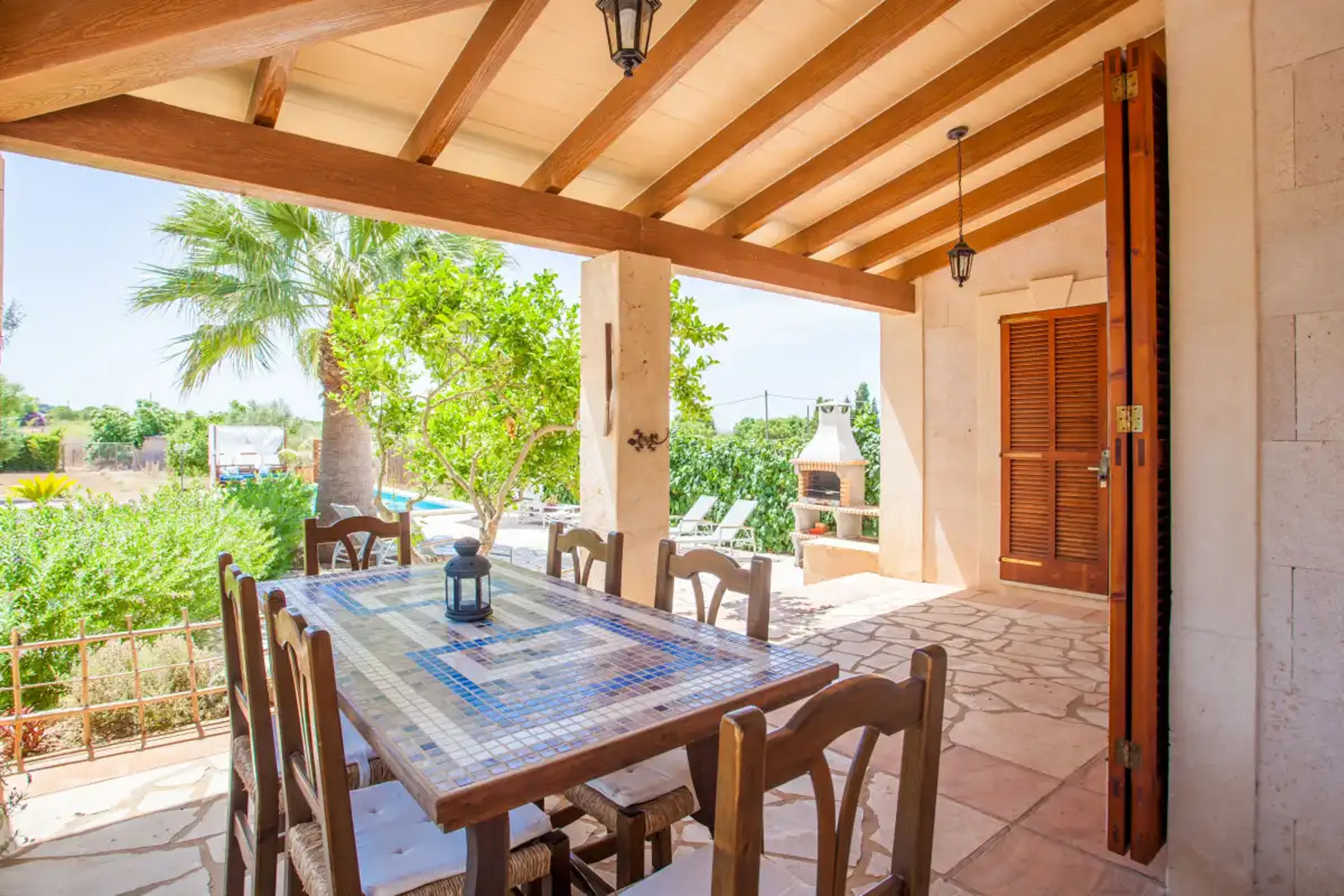 La zona exterior es la protagonista: piscina de agua cristalina, zonas de descanso, comedor bajo porche con vigas de madera y barbacoa para cenas largas al estilo mediterráneo. Además, ping-pong para añadir un punto divertido a la estancia.